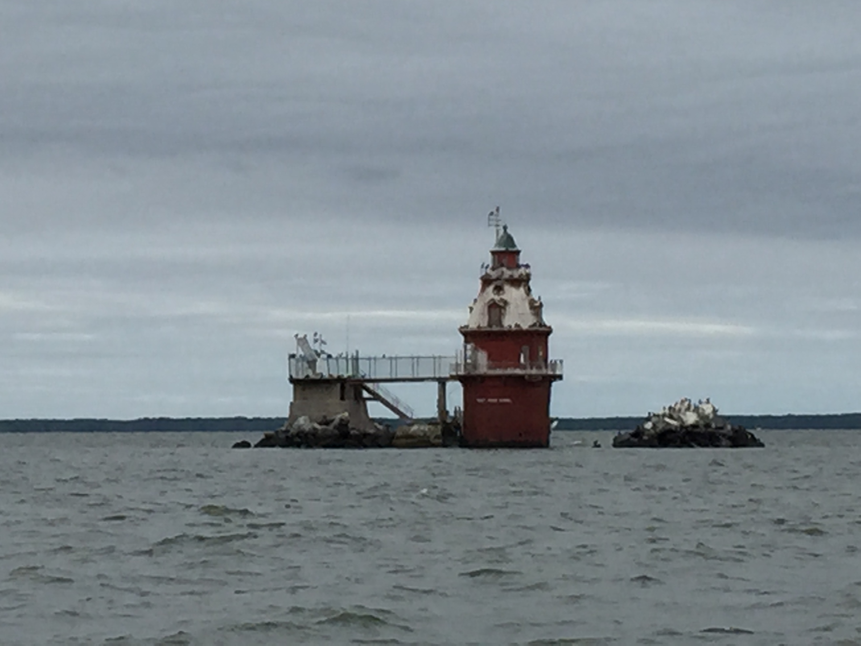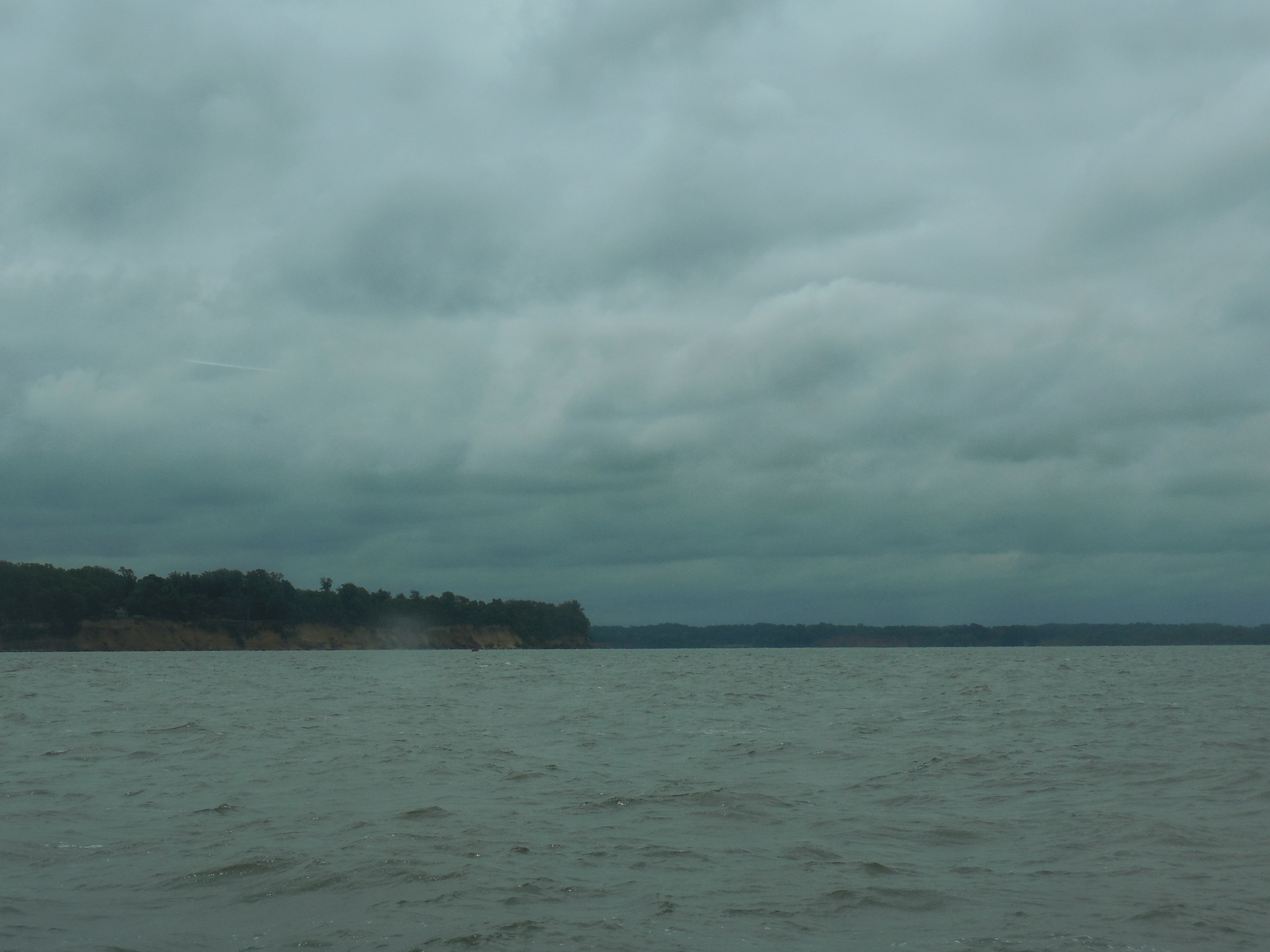 We got out onto the Patapsco River and we were taking a bit of a beating for about an hour and half. At the entrance to the Chesapeake Bay we had to stop the boat to tighten up the dinghy as the waves were crashing in on it. As we continued heading north, the Bay got narrow and the land blocked the wind, so the waves calmed a bit. Still, it was rainy and cold. The Maryland coastline on both sides here is quite different then in the lower Chesapeake; it is more mountainous and has lots of farmland. There are pockets of housing areas, but much of it is rural and really quite pretty.