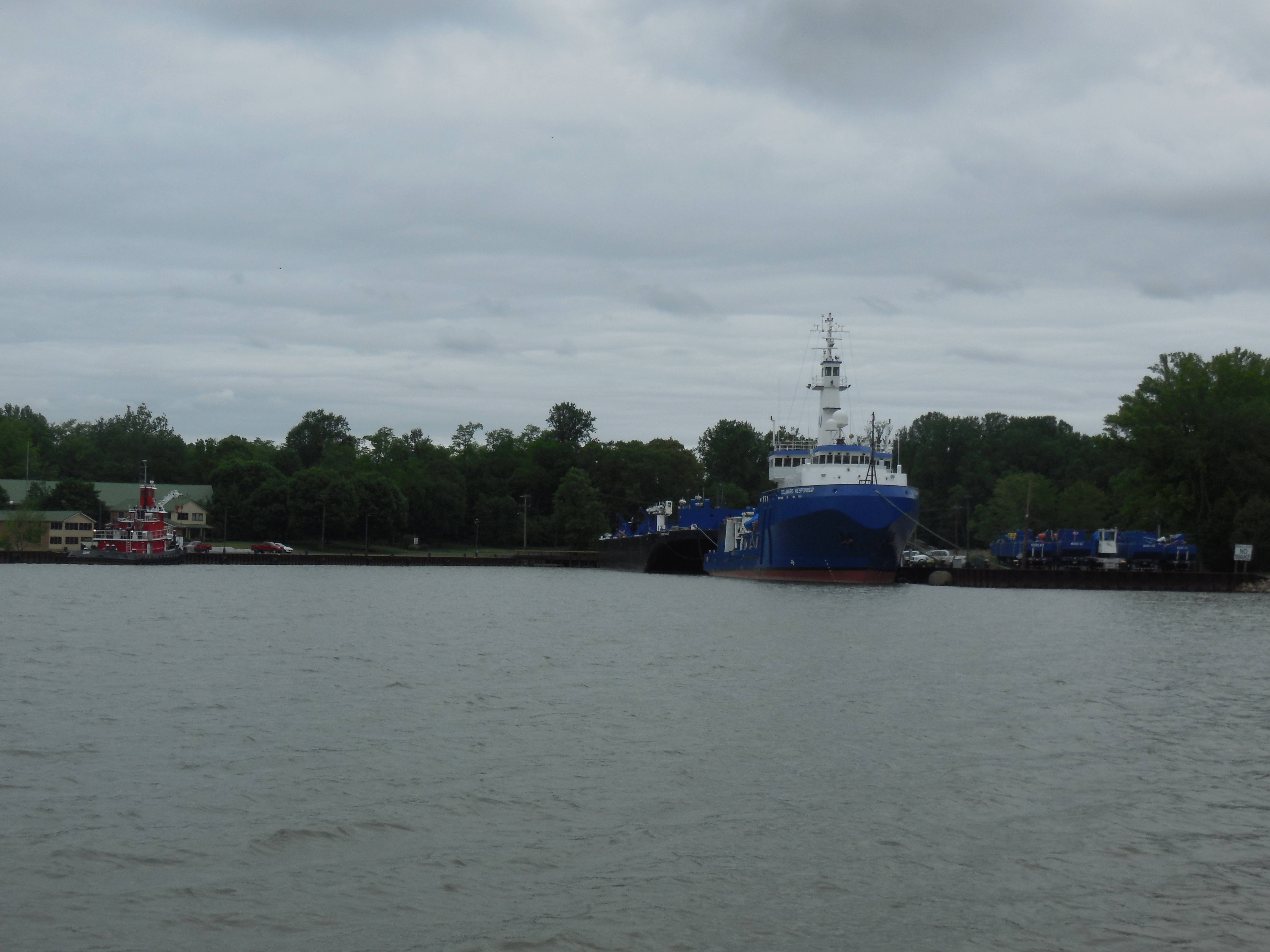 To the South (Starboard) side is the downtown area that has a city marina and anchorage that many cruisers stop at before going on to Cape May, NJ. We too should have stopped here….but we pressed on as it was only lunchtime. On the North (port) side is the Army Corps of Engineers dock, a restaurant, and then homes or rural roads along the way. Further up the canal there is also the North Summit Marina – another looper stopping point….and we should have stopped here too, but we pressed on.