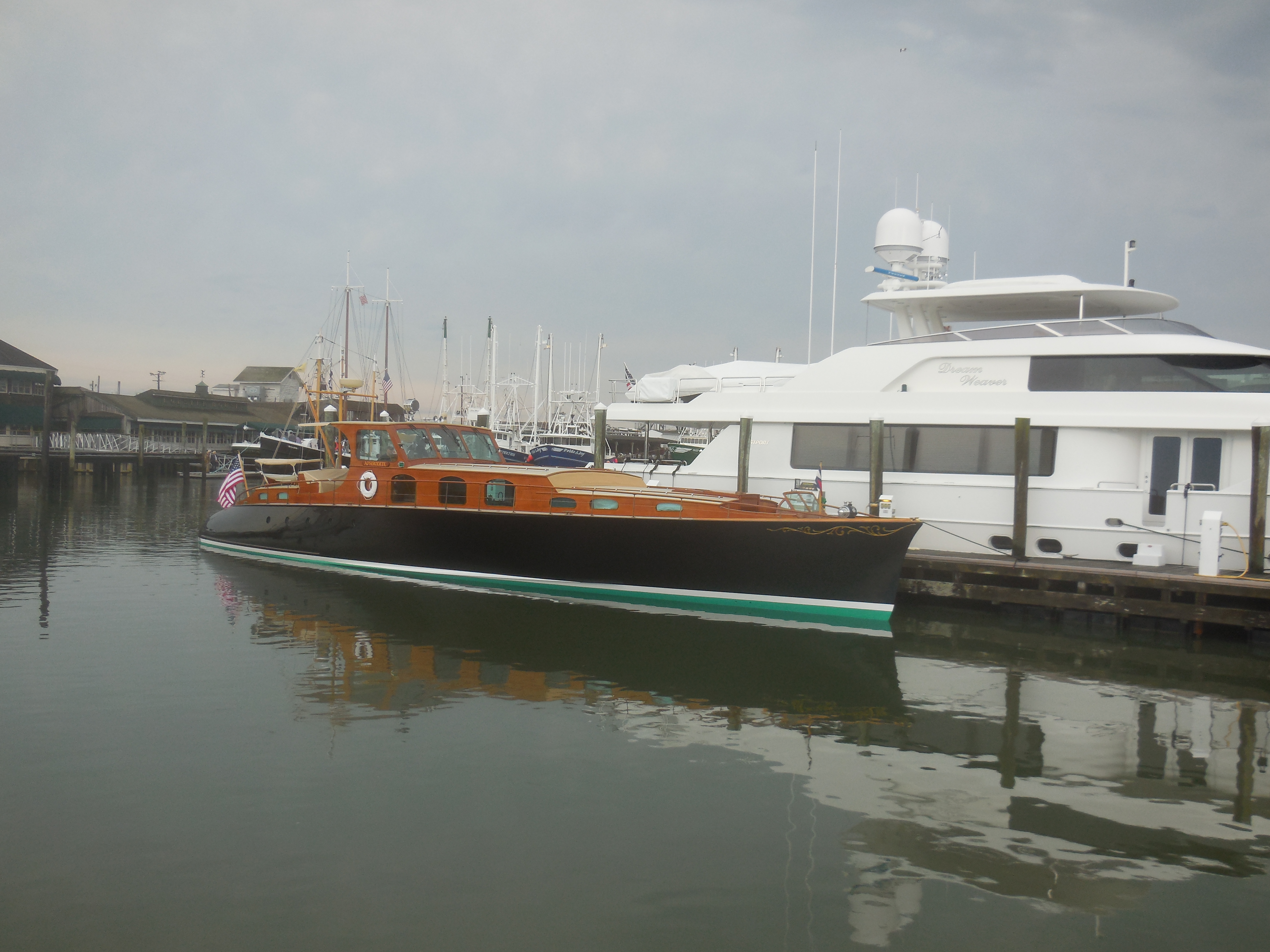 Of course by now the sky had cleared up and the storms were gone, but the wind was still blowing quite a bit. We watched several boats come into the marina and needed every amount of help to dock. We watched one fishing boat get so turned around that the dockhands eventually had him attempt entering into a different slip on a different pier. It was pure chaos and the dockhands earned their wages this evening. Of course all the boaters were trying to avoid hitting the large yachts, especially Aphrodite, a fully restored 1939 wooden boat located on the end of the first pier. It was a beautiful vessel docked perpendicular to our boat, so we had front-row seats to check her out.