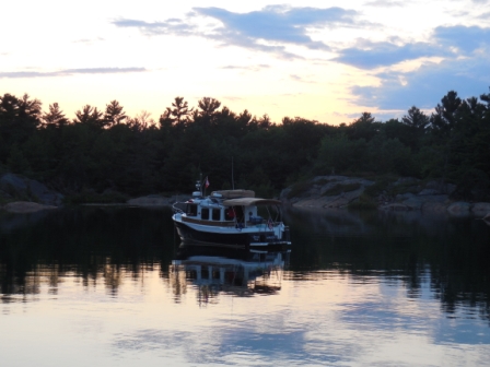 After lunch Mark & Denise got in the dinghy and went to talk to the Fleming 55. They are from Michigan and come to the Georgian Bay a lot; they are planning on staying here until mid-August. They gave us lots of suggestions for places here, as well as the North Channel and provided insight into facilities at Drummond Island. We educated them on the “Predict Wind” and “Active Captain” apps and then ended our visit.