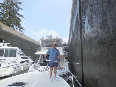 Tuesday (7/7) – We were up early and left Ess-Kay Yards at 6:40 in order to either make, or get in queue to make the first opening of Lock #23 (7:00 am). Unfortunately, by the time we got there, it was already full and we had to wait for the next opening. Here we were in line once again with other FL loopers “Andiamo” and “Speedy Delivery” as well as looper friends we have met along the way. In total there were 7 boats in this lock with us, and another 7 or 8 boats in the one behind us, including “Snug Tug”. We made our way through all 7 locks without incident, although we did find locking down to be a bit more challenging than going up. It is difficult for short people to grab the lines or cables when they are more than 5 feet from the boat. We were grateful for the assistance of Gold-Looper John (“Andiamo”) who would get off his boat and assisted other boats with their lines before the locking process started. He could do this as he had 3 other people on his boat to help him, and a rear steering station from which to maneuver his 60+-foot yacht.