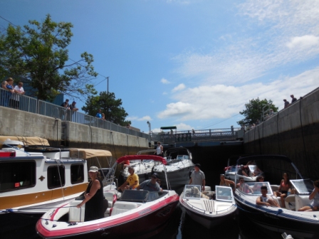 Thursday (7/16) – We left our dock in Peterborough at 7:15 am despite not being able to go far because the locks don’t open until 9:00 am and the first one is right near the marina. Our plan was to arrive early and be first on the blue line so we could be in the first lock opening. Sure enough, right behind us came Snug Tug, and shortly thereafter came Patriyachtik, Renegade & Tika. Unfortunately, Tika did not get in the first lock opening due to their size (52’), and ended up being behind us all day.