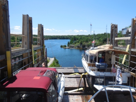 But perhaps the biggest thrill of the day was completing lock #44 known as the Big Chute. It is really not a lock at all, but a complex system of straps and rams that takes your boat over land and is known as the Marine Railway (See more here). Yup, you are literally raised out of the water and are transported across the road, via railway to the body of water below the pool at Big Chute. It is a fascinating engineering marvel that is simplistic and incredibly efficient. There is nothing high tech about it, and yet they transport about 40 or 50 boats through it each day during the boating season.