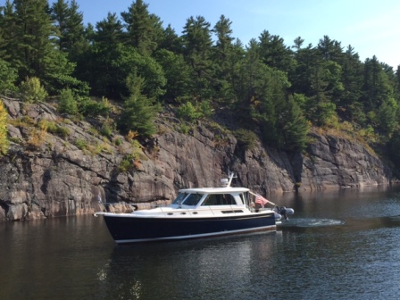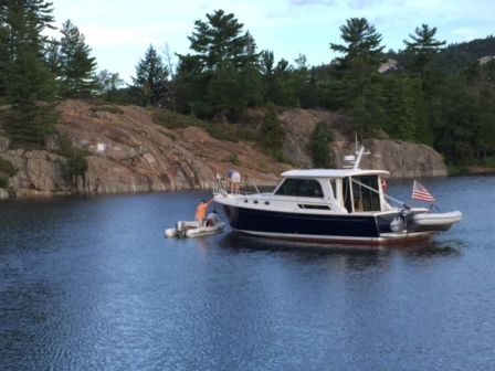 On the way to Baie Fine we passed through the Lansdowne Channel a long stretch of water surrounded by islands on both sides. In some areas here the channel can get narrow and boaters usually yield to the smaller craft, many (unlike in the ICW) do not slow down and their wake can send your boat rocking. When we came around the point and headed in the Small Craft Channel toward Frazer Bay whom did we encounter but “Lady O”, the 85-footer that was headed into Killarney. Of course he did not slow down and his wake rocked our world a bit!