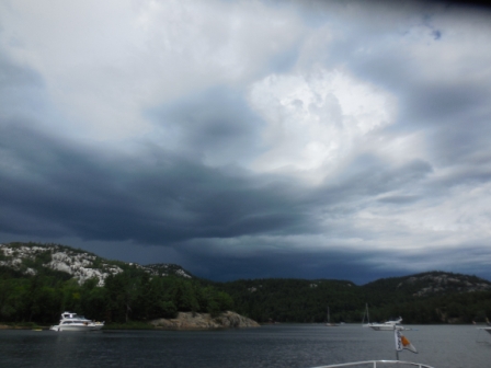 Therefore we pressed on to Gore Bay; a small town that was further west on the island called “Manitoulin”. Just as we got passed the last channel mark leaving Little Current we could see a squall and thunderstorm on the water. So we made the decision to seek shelter in a little anchorage off Picnic Island – just west of the town. We called TiKa and advised them and they joined us in the anchorage. No sooner had they put their anchor down then the wind kicked up and the storm blew through with winds gusting to 46 knots. We were grateful we were not out on the bay!