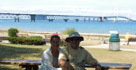 After we settled our boats, we went for a bike ride. First we rode along the water as there is a beautiful park with a bike path leading along the edge of Lake Huron, almost all the way to the Mackinaw Bridge. We stopped along the bike path long enough to take some pictures then continued on. We passed by the old Mackinaw Lighthouse, and we rode out to the fort and Welcome Center, but chose not to go in as it was getting late in the day and would not have been able to see much.