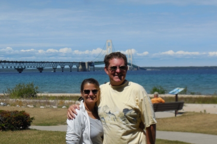 Friday (8/7) – Petoskey, MI – We woke up to a cool morning (53 degrees) and headed west, and eventually South, – a direction that will eventually take us home. Again buddy-boating with TiKa, we left the marina and within a half hour we went under the Mackinaw Bridge and entered Lake Michigan; cross off another “bucket list” item! The waves were a little bumpy throughout the morning, and the wind blew a bit, (10 – 15 kts), but it was tolerable for Denise who had taken a small piece of Dramamine as a precautionary measure.