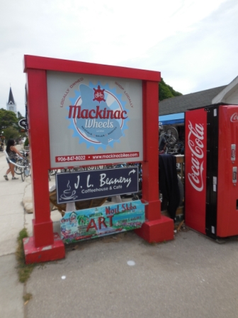 On the Northern and Western shores of the island we had terrific views of the Mackinaw Bridge and the Northern shores of Lake Huron. The bicycle traffic was much heavier at this point and there were several close-call collisions with other cyclists. Eventually we ended up back in the downtown area which had become quite crowded. We were anxious to return our bikes and get back on foot as it was just too congested to be on bikes and negotiating with the carriages and pedestrians.
