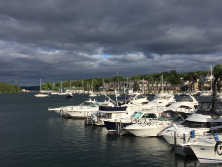 We then planned the rest of the day, including a dinner outing with all the Loopers. Mark had some work to do, so he took his computer and went up to the cruiser’s lounge where he had a better Wi-Fi signal. Denise worked a little on the blog and Claire read her book. Afterwards the girls dragged Mark back to Fishtown and the Leland downtown area to show him some of the things in town. In the meantime, the wind had picked up and it was really howling and a small craft advisory had been issued.
