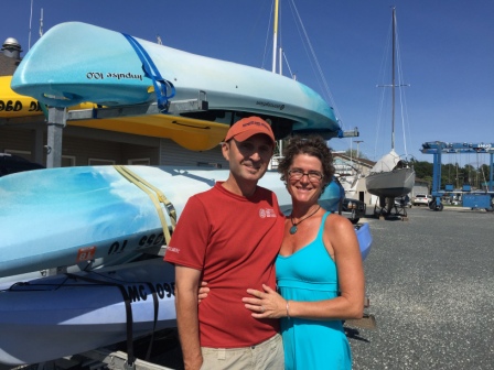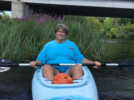 The rest of the journey passed without incident and we were treated to some terrific wildlife. We saw several immature bald eagles and came incredibly close to a loon that had been acting like our tour guide for about ½ mile downriver. The sun came out and the clouds disappeared, making for a beautiful day, albeit still windy. Because of this we intentionally passed our meeting spot to explore further down river, knowing the wind was in our favor to paddle back upstream against the current. So we continued another 15 minutes or so until we came to where the wind was blocked and would no longer help us. Then we turned around to go back. When there was a big gust of wind, instead of paddling Mark would hold up his paddle and use it as a sail. The wind was strong enough it would push him against the current. Eventually we got back to the meeting point and called for our pickup. Gregg and Bonny were there in 10 minutes, with a towel for Claire who was now freezing in the cold wind. They were terrific and we had such a great day!