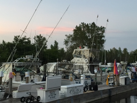 Very soon thereafter we got a slip assignment and pulled in next to a big Viking Sport fishing boat (named “Bottom Line”). Once we got the boat settled in, Mark checked us in and Denise & Claire found shirts to buy in the marina office. We ate a quick lunch aboard the boat, then Claire and Denise went for a walk in the town and did a restaurant reconnaissance for dinner.