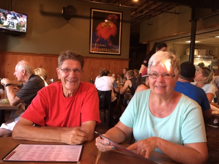 That evening we went to a restaurant called the Dee Lite Bar and Grill with Sid & Evelyn (“Something Special”). It was mostly bar type food, but was good enough for us to enjoy sandwiches and great company with another Looper couple. While there we ran into another Looper from Canada (John) who was there with his son (Lee) and his girlfriend (Rhonda). They too were enduring the rolling in the Municipal marina. All of us talked about the bad weather and how it was messing with everyone’s plans. John was trying to get to Chicago so Rhonda could fly home next weekend, and they were considering making a direct crossing of Lake Michigan when the weather broke. This is a scary proposition as it was 90 miles and the weather on Lake Michigan can be unpredictable in August. We prefer running down the coast and around the bottom at Indiana.