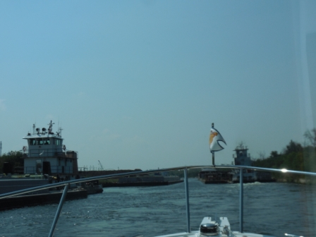 Shortly after this rendezvous, we approached a tug pushing several barges (generically known as “a tow”) and it was slow going after this. We were entering the “Fish Barrier” and there was no way to pass the tow. We had to wait for him to get through it, and then once we were through, we were able to pass him.