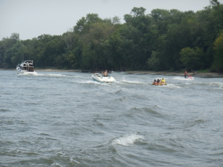 Once through the lock we cruised down the Illinois River passing many pleasure boaters and jet skis. We were grateful that most of the tows were not around as it would have been even more treacherous navigating the narrow parts of the river. We also chuckled about all the “SPORES” on the water, and fully understood what our Looper friend John P (“Endeavour”) meant when he told us this term in Solomons, MD. (SPORES = Stupid People on Recreational Equipment).