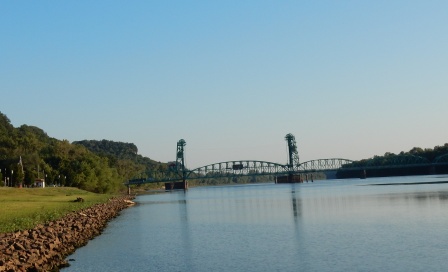 We continued traveling south to Alton, passing beautiful high cliffs, a water park, and then navigating a tow and the highway bridge right before turning into the tricky marina entrance.