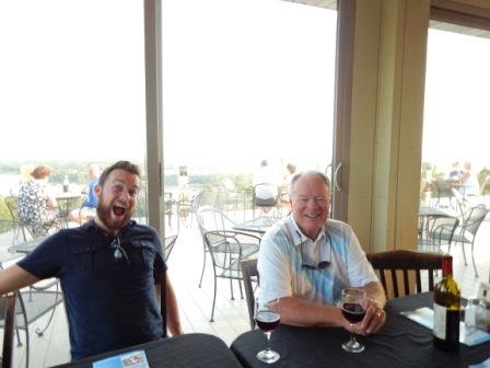 As we finished our chores quite late, our social director (Denise) did not have time to organize a Looper docktail. So, we informally planned one with Tim & Mark – the Younger (“TiKa”) whose boat was near ours. As we were gathering for it, we ran into Melinda and Bob (“Melinda B”) on the dock. They mentioned they were going to go to “Aerie’s Riverview Winery” at the top of the hill for dinner and invited us to join them. The winery, which is 5 minutes away, will come and pick us up at the marina and take us to their place. So in two separate groups, all 6 of us rode in dune-buggy style to the winery.