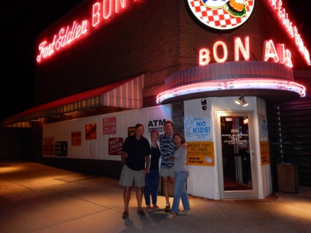 That evening for dinner we had an adventure outing planned with Dave & Betsy (“Fryedaze”), as well as Caryn & Willy Bain (“Next Chapter”) and Jann & Bill Mellman (“Ivory Lady”). Since two of us had rental cars, we went up the road to a place called “Fast Eddies Bon Air” which is a renowned (huge) bar in these parts– or really a bunch of connected rooms of bars – that serves a limited menu of food but with enough choices we all could find something to eat. You order your food as you come in and then go sit down and order your drinks from the waitress. When they call your number you go up to the main counter and get your food. You must order a drink, and no take out is allowed – those are their rules. The food is cheap and so are the drinks. But you go to hear the music and to people watch. It is a hoot! You will see all types and we saw it all: old, young, singles, couples, bikers and “biker wannabees”. There were at least 2 bride/bachelorette parties and one 50th Birthday party that we ran into. When we arrived there was one band playing, then they wrapped it up and a guitar soloist was playing. By the time we left another band was just getting set up. It was a lot of fun and we were glad we did it all together.