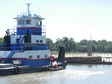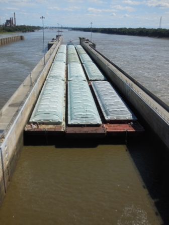 We arrived in time to watch a tow go through with 15 barges. Although they only had to lock him up 23’, the lock is long and wide enough that the entire tow could fit in without having to be broken down into two separate locks. This is a tremendous improvement compared to the locks on the Illinois River, and therefore saves a lot of time.