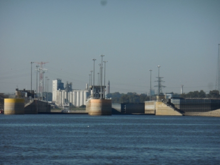 From there we took our time cruising the next 15 miles to the second lock (Chain of Rocks lock) as we knew we they would want us all to lock together again. So Mark slowed the boat to 1300 RPM (we usually cruise at 2050 doing 15 kts) and we still managed to go 10 kts thanks to the Mississippi River current running in our favor. In no time at all we made it to the lock but had to wait another 45 minutes. During that time, the slower boats were able to catch up to us so we all got through together. Once through the lock we were able to increase speed and not worry about staying with the other boats. We were done with the locks for the day and we wanted to get to our destination; Hoppies Marina.