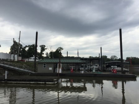 When we woke up in the morning it was raining, and severe weather was forecasted for the day. So, we wanted to get underway as soon as possible so we wouldn’t have to encounter the storms while on the water. After calling the marina and confirming they could take us early, we left Grafton and headed out. It didn’t take long to get to Port Charles, but we did have to fight a 2 knot current and navigate around lots of debris in the water running downstream on us. Of course as we approached the fuel dock the skies opened up and it poured. Denise got drenched trying to tie up the boat, but Katie (marina operator) got just as wet. We agreed to wait until after the storm passed to take on fuel.
