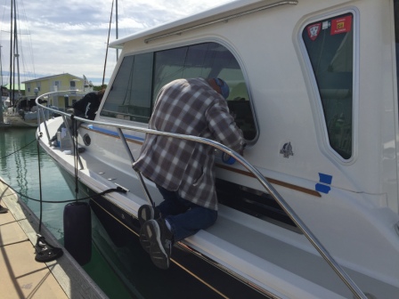 Shortly after 10 am, Jorg showed up with his helper Ken, and the two of them went to work on removing the rest of the old caulking. After that they had to clean and then prepare the area for the new sealant to be applied. The actual installation of the new sealant was the easiest and fastest part and by 4:30 pm the job was done. The boat looked better, our leak was repaired, and our bank account was now lower.