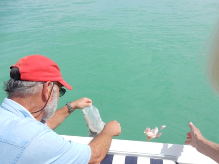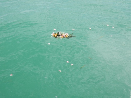 It was a perfect day to go out and be on the water as the winds had died down and the waves were mostly flat. It was sunny and warm, but not hot. So we left MYC and cruised under the 7-mile bridge to the Atlantic side and headed 3 miles out. Once we found the appropriate spot Jeff emptied the bag of ashes overboard while Carol read a poem and dropped a rose bouquet into the ocean. It was really a unique event and we felt honored to be able to help them with this task.