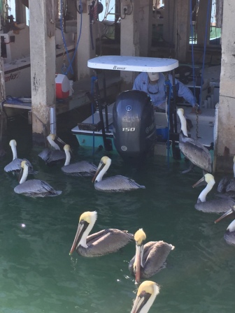 Afterwards, we headed to Islamorada where Denise wanted to pick up a birthday gift for her brother at Bud N Mary’s marina. This is a well-known place that people come to go out fishing from one of their many charters. While there, some of the boats were coming in with coolers full of fish. You could tell they had a good day by the number of pelicans that hung out behind their boats. You could also see the resident tarpon in the water also hoping to get a bit of the leftovers after cleaning.