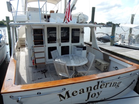 We immediately met Joy, the woman in the boat two slips down from us who claimed she did not even hear us come in. She and her husband Steve are on their Fleming 55’ (“Meandering Joy”) and are from Athens, GA. We spoke with her briefly and learned that our Looper friends on “Patriot” had been in the slip between us the night before. Again – small world.