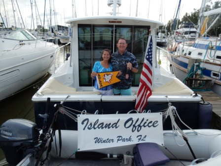 After we tied up, settled the boat, ate some lunch, and checked into the marina office, Denise published the last blog update while Mark cleaned the outside of the boat. Soon afterwards we met some of our new marina neighbors and then began the celebrations which included pictures, a champagne toast and now flying our Gold Looper burgee!