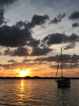 We enjoyed our chats then moved on to the first sailboat in the anchorage, only they were not in their cockpit or appeared available for socializing. So we respected their privacy and returned to our boat in time for happy hour and to see a fourth boat pull into the anchorage. Then all of us (3 sailboats plus us) settled in for the night. Mark fired up the bar-b-que and grilled some great steaks while Denise made rice and a salad. We then watched a terrific sunset. It was a perfect ending to a perfect day, and the last night for us on the Loop.
