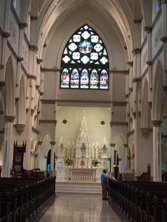 We arrived in the Charleston area to a very windy day and fighting a vicious current, making docking a real challenge. As usual, Mark did a stellar job and we successfully tied up at the Harborage at Ashley Marina for the night. Our usual free-dockage at Bristol Marina (where we bought the boat) was occupied by boats from the “In-the-Water” boat show and they would be leaving the next day. So we put up for a night at this marina, literally next door. We then got quick showers, and took Uber to downtown Charleston for an early dinner at our favorite Thai restaurant (Basil Thai) and on to Cathedral of St. John the Baptist for 6:00 mass, arriving just in time for the start. After that we took another Uber ride back to the marina for the night.