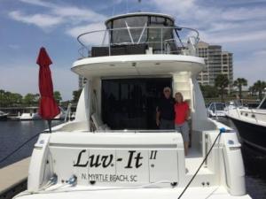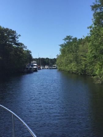 We left Georgetown at 8:00 in the morning and cruised along the ICW, leaving the low-country of South Carolina to more forested scenery. You can tell we were getting close to the North Carolina border. Just outside of Myrtle Beach we stopped for fuel at Osprey Marina – a much protected marina with a great reputation, but is a bit removed from anything. Since Denise would be staying on the boat while Mark traveled to a client-site, we wanted a place that had more to offer. Our only purpose for stopping was the great price for diesel fuel ($1.96) – and when you say “fill ‘er up” – cents matter!