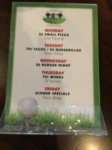 Feeling adventurous we broke out the bicycles and rode to “Putter’s Pub” for a terrific wood-fired pizza. This was a great find and we were so happy to learn of it. It was delicious, affordable and the place was the “fun spot” to be. It is the community sports bar that overlooks one of the fairways, and has TV screens everywhere. Plus it has week-night specials including Taco Tuesday ($.75 each), Hamburgers on Wed ($6 each), and wings on Thursday ($.75 each). When we left the place was packed with golfers, families, etc. and we couldn’t help but wonder why all these people were still out on a “school night”.