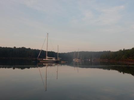 When Denise woke up in the morning there was no evidence whatsoever of the previous night’s fog. The air was cool (cold in fact) and the anchorage was pristine. There was not a ripple on the water and the sunrise was spectacular.