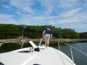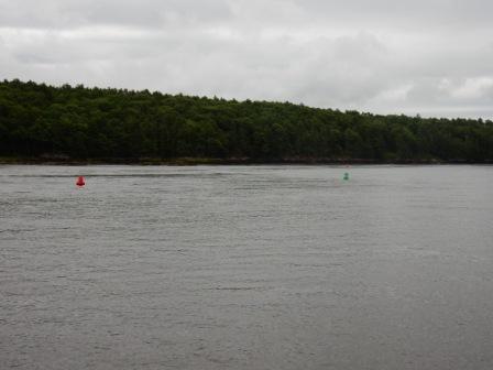 Right on time we pulled away from the dock and were on our way. Only this time we were not going out into the Gulf of Maine (Atlantic Ocean), but rather taking an inside route via the Sasanoa River to a marina called Derektor Robinhood (aka Robinhood) in Riggs Cove. Although it wasn’t far (7 miles) we had to go through some very harrowing areas (known as “Upper Hell’s Gate”) and lots of rocks and narrow channels.