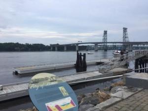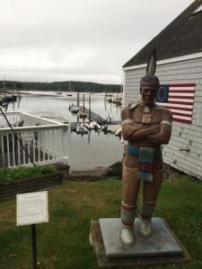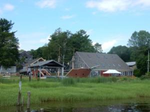 We had reservations for a mooring ball at the Maine Maritime Museum, located just south of the town. However, when we arrived there were no open moorings. We contacted the Museum and had to wait while the “new person” got instructions from her supervisor; all the while waiting in the middle of the river as the swift current wanted to take us north. Eventually, they figured out a mistake had been made and offered to let us stay on the dock behind the “Merrymeeting” tour boat for the same reduced price as a mooring, but we had to be off the dock by 9:00 am the next morning. We accepted their apology and tied up to the floating dock, thinking their mistake was our good fortune.