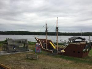 Across the campus from the museum is a restoration center where they had just begun work on the Mary E, believed to be the oldest Bath-built wooden schooner still afloat. It had come “home” for its restoration and a separate pavilion had been built just for it. There is also building dedicated to the history of lobstering, and a lobster car (we have seen one similar in the Orlando area). Near there is a playground for children that is very unique with its boat-themed fort and an oversized wooden lobster trap.