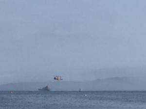 Fortunately, as we got closer to Great Chebeague Island the fog seemed to lift for us and we were able to get through the area without a problem. Of course once back into the bay there was more fog, but it was still pretty light and we were able to get into the marina without incident. We arrived in time to grab some lunch and watch a Coast Guard helicopter conduct exercises in the bay near the marina.