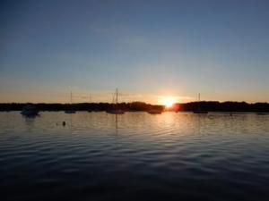 We made our way back to the boat via the dinghy and prepared a dinner of leftovers. We watched the sun set over the harbor and heard the cannon shot from the Shelter Island Yacht Club to mark the occasion.