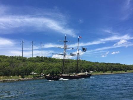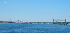 From at least 5 miles before you come to the Canal you can see the railway lift bridge which is just inside of the Cape Cod Canal. At the entrance to the canal is the Massachusetts Maritime Academy and their training vessel the “Kennedy” which is also visible from afar. But before you get there you have to get through some swirly water.