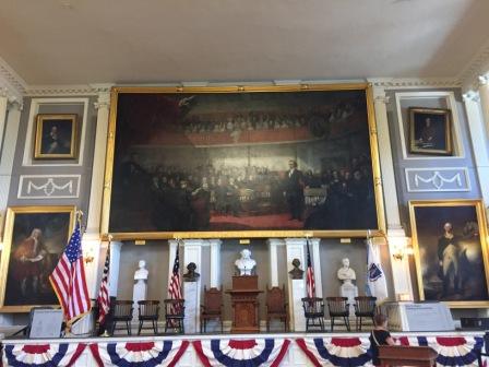 After lunch we walked around the area and then walked to Faneuil Hall. We arrived in time to listen to the 15 minute lecture about its use as one of the first places where ideas for independence from Great Britain were formed. Here was the site of several speeches by Samuel Adams, James Otis, and others. The hall is still in use today for town business, and in fact right after the lecture there was to be a city maintenance meeting and they were setting up for it.