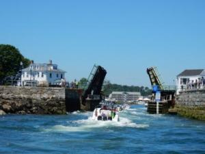 After requesting an opening we turned into the narrow opening of the Blyman Bridge and entered the Annisquam River. As luck would have it, there were a few other SPOREs ahead of us and kicking up the waves, making it a nail-biting passage.