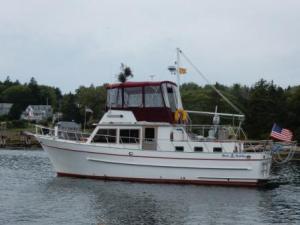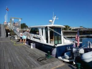 Once back from our loaner car trip, we went back to the boat to work and relax. A down-east style boat pulled into the marina and they put them on the inside pier perpendicular to us. Once they settled their boat we talked with them for a while about our mutual boats and their desire to do the Loop.