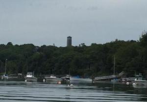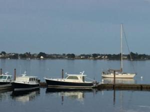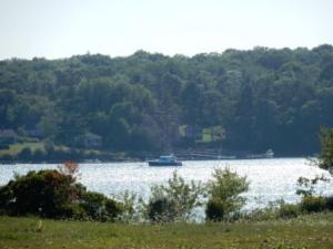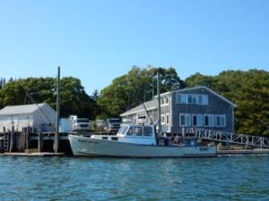 During the day it was very windy as predicted, and the west wind blew a lot of the water away from the shoreline across the harbor towards Bailey Island. We hung out on the boat or around the marina and socialized with some of the other boaters who were here. Some of these were Maine locals who come here for weeks at a time and hang out in the area using their dinghy to go over to Bailey’s or Eagle Island. Denise met one such couple who live near Lewiston Maine. Al and Johnna (like John only with an “a” at the end) come here every year for a month. They help out at the marina with small chores and will transport people to nearby Eagle Island (for a fee) and back via their dinghy which is a small open center console boat. We met their dog “Bullet” who hangs out with and the marina dog “Coda” – owned by Don, brother of the marina owner (whom Denise met when we were here in July).