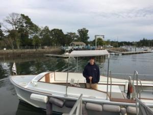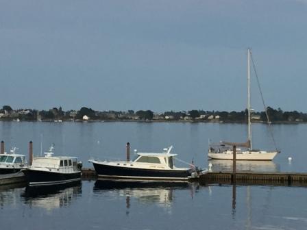 Shortly after Mark returned, we watched several boats come into the mooring, including a Looper boat “Bear Holiday”. We met Bear & Gerry Thompson in Croton-on-Hudson in June 2015 when we were on the Loop. Once their boat was settled, they came over in their dinghy and we chatted for a bit about “the Great Loop” (which they took 3 years to do). They are from Falmouth, Maine and are members of Portland Yacht Club. We spoke of our mutual friends Bob and PM (“Velo-Mer”) and our chance encounter with them at PYC.