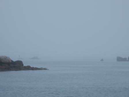 Finally at 8:00 we decided to go and pulled out of Cuttyhunk Marina in pea-soup thick fog. Once out on Buzzards Bay it was just as thick and we could see it was not going to let up at all. For the next 2 hours we were like bobble-head dolls, swiveling our heads to look in all directions while watching the radar. Add to this the “low fuel” alarm continued to beep and Denise found this very stressful.