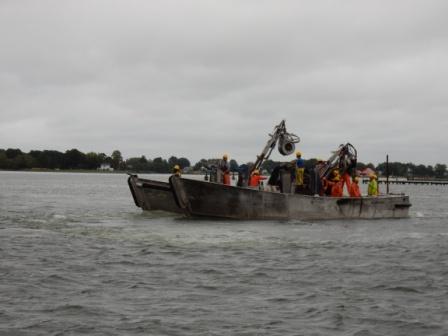 We slowly made our way through the no-wake zone and out of Cockrell Creek, bypassing the town of Reedville and eventually the Omega Protein Fish Processing plant. Here we saw two crew boats working to transfer the fish nets off one boat and on to another, even though the wind was blowing and there was a bit of a chop.