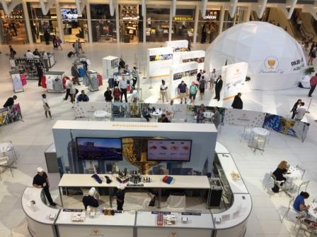 After a quick bite to eat we walked back towards the WTC and Oculus, seeking out a public restroom. The main lobby area was all set up for the President’s Cup – the golf tournament taking place right across the Hudson River. The displays included everything from PGA golf attire to purchase, to a bar sponsored by Michelob Ultra. They were broadcasting the ceremonies from the golf tournament on a big screen and many people were looking on from all around. We found our restrooms and left as soon as possible to get on with our day.