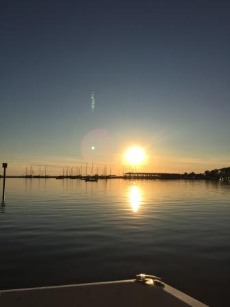 We settled the boat, checked in at the marina office, and went back to the boat for a well-deserved adult beverage. Not wanting to cook and now very tired, we decided to go Waterman’s Crab House for dinner. This restaurant is right next to the marina and we ate there the last time we were here. It is usually a happening place, with a live band every Friday and Saturday in the summer. We got seated right away and the place was very empty, despite great weather. Mark ordered shrimp and Denise ordered steamed crabs, trying to capture one last bite before the end of the season. They were good, but a lot of work. Next time she will order the soft-shell sandwich instead. The best part of this place is the million-dollar view and we got our money’s worth with this spectacular sunset tonight.