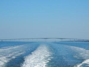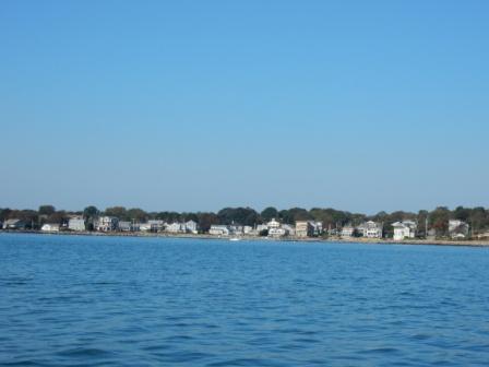 We left with almost no wind, but 4’ swells were expected once we left Narragansett Bay and Denise was a little nervous about getting seasick. Along the way we got to see sights that we were unable to see when we came up the Narragansett in thick fog, like the Jamestown-Verrazano Bridge, the University of Rhode Island – Bay Campus, and houses on the western coastline.